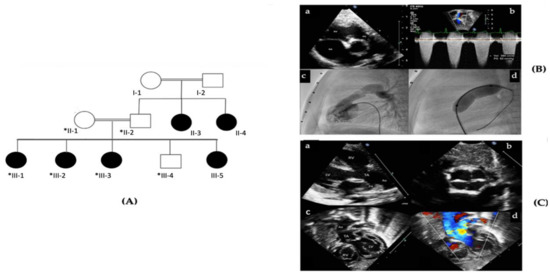 The proband patient in this study is a 10-year-old female belonging to a Saudi consanguineous family (III-3, Figure 1A). The family consists of two healthy parents and five children (4 affected females and 1 healthy male). The proband has been diagnosed with pulmonary stenosis and tricuspid regurgitation. Her younger sister (III-2), 9-year-old, suffers from pulmonic stenosis (PS), truncus arteriosus (TA), and ventricular septal defect (VSD). Both siblings were diagnosed and treated at the Department of Pediatric Cardiology, King Abdulaziz Medical City, Ministry of National Guard Health Affairs, Riyadh, Saudi Arabia (Figure 1B,C). The other two affected females (III-3, III-5), 7- and 3-year-old, respectively, showed mild cardiac anomalies that healed on their own. Table 1 summaries the clinical features and medical history of the patients involved in this study. Similarly, the father’s two sisters (II-2 and II-3) suffered from congenital heart anomalies, specifically a septal defect and the condition healed spontaneously without medical intervention in both cases. Ethical approval for this study was obtained from the Institutional Review Board Committee at King Abdullah International Medical Research Centre, Riyadh, and a written consent form was signed by the patients’ parents.