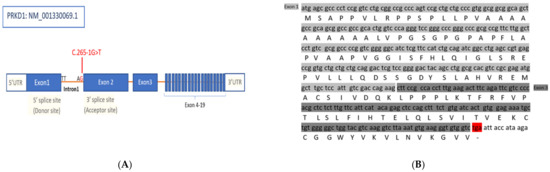 Schematic representation of PRKD1. (A) structure of the PRKD1 gene and the splice mutation position (c.265-1G>T) in the variant reported in this study. (B) Nucleotide sequence and predicted amino acid sequence alignment of PRKD1 variant. The exon 2 skipping event detected in PRKD1 cDNA (NM_0011330069.1: C.265-1 G>T), is predicted to truncate PRKD1 transcript by the formation of a premature stop codon highlighted in red.