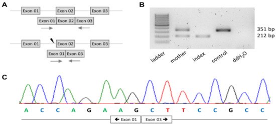To enable analysis of the PRKD1 transcript, separate blood samples were collected using the PAXgene® Blood RNA Tube system (BD Biosciences, Franklin Lakes, NJ, USA). The samples were used to prepare mRNA according to the manufacturer’s instructions. Subsequent PCRs were carried out using standard reagents and equipment. We used Primer3Plus software for primer design (http://www.bioinformatics.nl/cgi-bin/primer3plus/primer3plus.cgi (accessed on 22 November 2020)). We applied a forward primer that binds in exon 1 and a reverse primer that binds in exon 3 (Table 2). The size of the expected product was 351 bp. Templates for the PCRs were from the index, from the heterozygous mother and from a wild-type control.