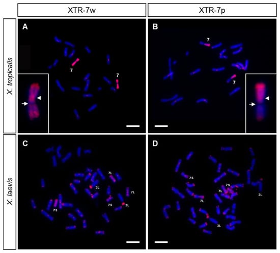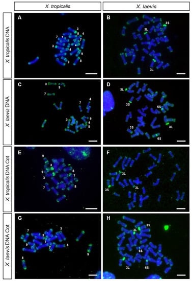 Mitotic chromosomes from X. tropicalis (three females and two males) and X. laevis (three females) were obtained from secondary cultures as described previously [47]. Briefly, colcemid (Invitrogen, Waltham, MA, USA) was added to the culture medium at a final concentration of 0.1 µg/mL. After 5 h of incubation, cells were harvested, centrifuged and treated with a hypotonic solution (0.4% KCl) for 20 min. The cell suspension was fixed in methanol and acetic acid (3:1 v/v), washed three times with new fixative and dropped onto microscopic slides.