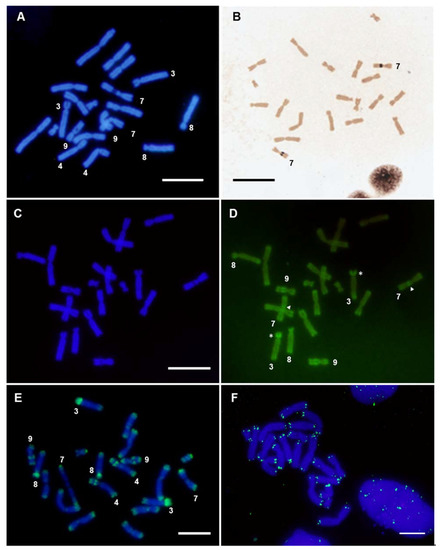 - Kato, A.; Vega, J.M.; Han, F.; Lamb, J.C.; Birchler, J.A. Advances in plant chromosome identification and cytogenetic techniques. Curr. Opin. Plant Biol. 2005, 8, 148–154. [Google Scholar] [CrossRef] [PubMed]