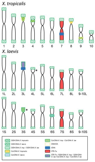 - Matsuda, Y.; Uno, Y.; Kondo, M.; Gilchrist, M.J.; Zorn, A.M.; Rokhsar, D.S.; Schmid, M.; Taira, M. A New Nomenclature of Xenopus laevis Chromosomes Based on the Phylogenetic Relationship to Silurana/Xenopus tropicalis. Cytogenet. Genome Res. 2015, 145, 187–191. [Google Scholar] [CrossRef]