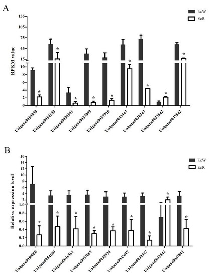 Expression profiles of nine selected unigenes between EcR and EcW prawns. The x-axis represents the names of selected unigenes. Columns represent the RPKM value from the transcriptome result (A) and the means of relative expression levels from the qPCR result (B). The significant difference in the expression levels between the EcR group and the EcW group was labeled with asterisks (*) at p < 0.05.