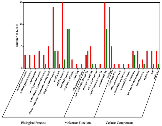 GO annotation of DEGs. DEGs with a GO annotation were divided into three major categories: biological process, cellular component, and molecular function. Red columns represented the DEGs with higher expression levels in the EcR group, while green columns represented the DEGs with lower expression levels in the EcR group.