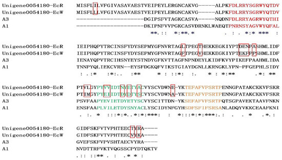 Alignment of crustacyanin amino acid sequences. Unigene0054180-EcR and Unigene0054180-EcW represented the crustacyanin in the orange-red-variant prawns and the wild-type prawns. A1 and A3 represented the crustacyanin subunit proteins in the lobster. Amino acid sequences of lipocalin consensus regions were colored, and different amino acid residues between the orange-red-variant prawns and the wild-type prawns were highlighted in the red box. Asterisks (*) indicated positions which had a single, fully conserved residue, while one black dot (.) and two black dots (:) indicated that the residue sites were less conserved but their physicochemical properties were similar or very similar.