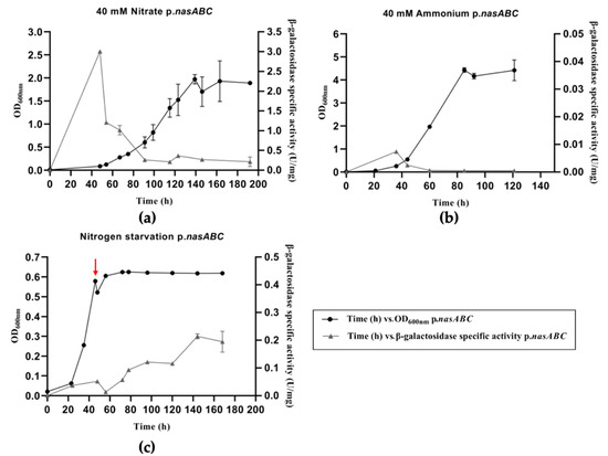 The effect of nitrogen starvation on bgaH activity is shown in Figure 1c. It was very low before inducing the nitrogen starvation; however, after 54 h, the activity increased, reaching a maximum activity of 0.2 U/mg at 140 h of starvation. Despite obtaining β-galactosidase activity under these culture conditions, its levels were approximately six times lower than those obtained in a defined medium with nitrate as a nitrogen source. The β-galactosidase-specific activity results revealed that the nasABC genes would be expressed under these limiting conditions, which are consistent with previous studies [21,22].