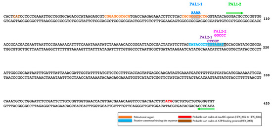 In relation to the characterization of PAL1-1 and PAL1-2 in the defined medium with ammonium as the nitrogen source, the growth profiles and β-galactosidase activity did not show significant differences, with β-galactosidase activity not being detected as in the case of p.nasABC. Additionally, β-galactosidase activity was checked under nitrogen starvation culture conditions in both transformants, PAL1-1 and PAL1-2, and similar values to those measured with the p.nasABC were obtained (Figure S3). Based on these results, it appears that these modified regions in PAL1-1 and PAL1-2 transformants are not involved in the binding of any transcriptional regulator implicated in the regulation of nitrogen metabolism. It is possible that this palindromic region could be involved in the expression regulation of a divergently encoded gene, which codifies an ATP-binding protein (HFX_2001), on the opposite strand of the nasABC operon.