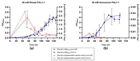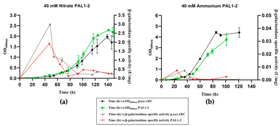 In defined media with nitrate, PAL1-1 and PAL1-2 transformants showed the same growth and β-galactosidase-specific activity (U/mg) profile as p.nasABC transformants (Figure 3a and Figure 4a). Both followed a typical growth profile in the presence of nitrate as a nitrogen source, showing a more extended adaptation phase at the beginning of the growth period that was non-existent when using other nitrogen sources such as ammonium (Figure 3b and Figure 4b) [21].