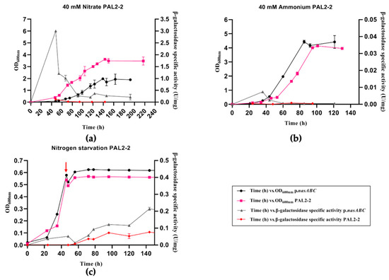 Cell growth, followed by measuring OD600nm, and β-galactosidase-specific activity, determined for the Hfx. mediterranei PAL2-2 transformant in two different defined media supplied with a nitrogen source of 40 mM nitrate PAL2-2 (a) and 40 mM ammonium PAL2-2 (b). The third sample was kept under nitrogen-starved conditions (c). Timepoint where nitrogen starvation starts is indicated with a red arrow.