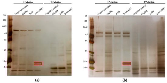 Once the DNA–protein pull-down was performed with the different DNA samples (glucose dehydrogenase gene; p.fdx; p.nasABC), the elution fractions obtained were analyzed via SDS-PAGE and silver staining (Figure 6). Comparison of the protein band profiles in each line (controls and sample) allowed for the identification of the band, which only appears in the sample with the target DNA (p.nasABC). The negative control without DNA allowed us to identify and discard the possible unspecific protein binding to the DNA magnetic beads complex. The use of the glucose dehydrogenase biotinylated fragment allowed for verification of the unspecific union of a protein to any DNA fragment. The ferredoxin biotinylated promoter was used to test the unspecific recognition of the promoter sequences.
