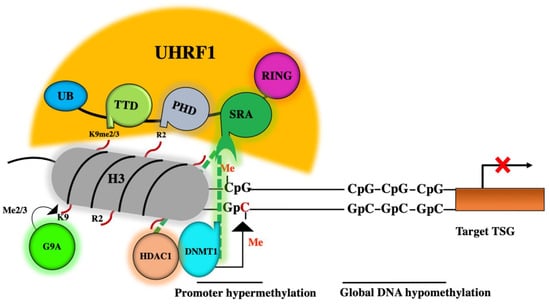 In tumors, no clear mechanisms are yet identified that explain the maintenance of the inheritance of a silenced TSG from a mother cancer cell to the daughter cells during cell division. However, the functioning of UHRF1 as the conductor and hub protein in its complex could ensure this transmission during cell division [,,,,,,,,,]. Indeed, several in vitro and in vivo studies have reported the detection of UHRF1 overexpression in many human cancers, and that this overexpression is a crucial factor in the epigenetic silencing of various TSGs and leads to enhanced cell proliferation, cell cycle progression, and suppression of apoptosis [,]. UHRF1 uses its different domain functions to repress the expression of TSGs through several mechanisms that involve TSG promoter hypermethylation via the physical interaction with DNMT1, HDAC1-mediated histone deacetylation, and G9a-catalyzed histone 3 methylation [,] (Figure 1).