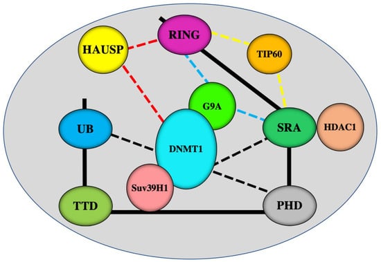 Schematic representation of interactions of UHRF1 domains with various epigenetic writers and erasers. UHRF1 uses its SRA domain to interact with DNMT1 [,,] and HDAC1 []. UHRF1 can also interact with DNMT1 through PHD [] and ubiquitin-like domain (UBL) [,] domains (black lines). HAUSP (herpes virus-associated ubiquitin-specific protease) interacts with both UHRF1 and DNMT1 [,] (red lines). Via its C-terminal region which covers the SRA and RING domains, UHRF1 interacts with histone methyltransferases G9a [] (blue lines) and histone acetyltransferase Tip60 [,]. UHRF1 can interacts with another histone acetyltransferase Suv39H1 []. DNMT1 can also interact with Suv39H1 and G9a [].