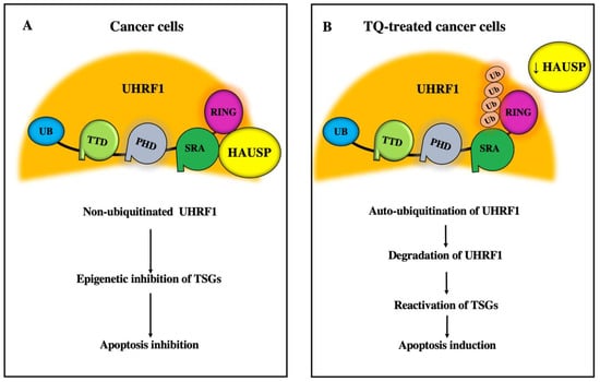 TQ decreases the expression of the UHRF1 protein in p53-deficient Jurkat cells in parallel with an upregulation of the tumor suppressor p73 []. The depletion of p73 in Jurkat cells can protect UHRF1 from TQ-induced degradation, indicating that the high expression levels of UHRF1 detected in either blood cancers or solid tumors with p53 mutations [,,,] could be attributed to a loss of p73 expression. Similarly, the low expression levels of UHRF1 were also restored in TQ-treated Jurkat cells when phosphodiesterase 1A (PDE1A) was overexpressed, while p73 expression was significantly repressed, suggesting that the TQ-induced downregulation of UHRF1 can be attributed to the inhibitory effects of TQ on PDE1A through some as yet unknown mechanism []. Recently, our team demonstrated that TQ induces the degradation of UHRF1 through a rapid auto-ubiquitination process involving its RING domain, and that this mechanism appeared to be correlated with a decrease in the expression of its partner HAUSP []. Interestingly, no UHRF1 ubiquitination was detected in the TQ-treated cells that expressed a UHRF1 mutation that specifically targeted its RING domain, again supporting an autoubiquitination of UHRF1 through its RING domain in response to TQ []. These findings indicate that UHRF1 is protected from degradation in cancer cells through its direct interaction with HAUSP, leaving it free to inhibit TSGs, with the subsequent inhibition of apoptosis (Figure 3A). Conversely, TQ treatment decreased the expression of the HAUSP protein, removing the protection of UHRF1 and leaving it vulnerable to autoubiquitination through its E3 ubiquitin ligase activity, with subsequent induction of apoptosis (Figure 3B). Taken together, these study findings suggest that UHRF1 is a main target of TQ, which triggers autoubiquitination of UHRF1 through its RING domain, thereby allowing the reactivation of several TSGs, with subsequent suppression of cell proliferation, promotion of cell cycle arrest, and induction of apoptosis. This also suggest that TQ could be a promising epidrug that acts via a specific inhibition of UHRF1 expression levels in cancer cells without affecting its expression in normal human cells.