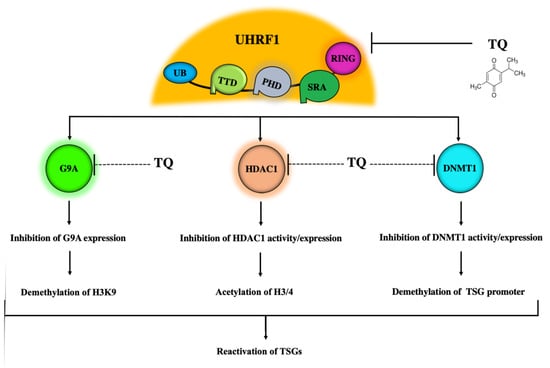 Of particular interest to this review is that several studies have now shown that TQ can target the epigenetic reader UHRF1 as well as its partners, the epigenetic writers (DNMT1 and G9A) and erasers like HDAC1 [,,,,,,,] (Table 1).
