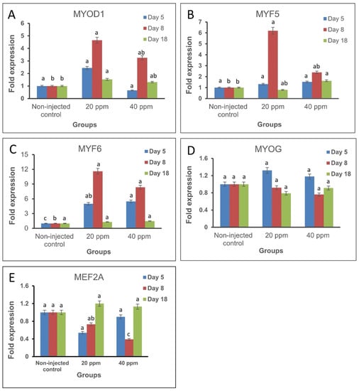 Least square means and their standard errors for the effect of Nano-Ag treatment (20 and 40 ppm) on the expression of myogenic determination factor 1 (MYOD1), myogenic factor 5 (MYF5), myogenic factor 6 (MYF6), myogenin (MYOG), and myocyte enhancer factor 2A (MEF2A) on days (D) 5, 8, and 18 of incubation. The expression is presented in fold change compared with the non-injected control, (n = 3, from each group).