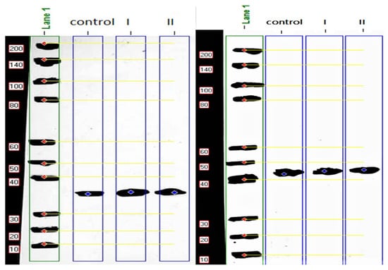 - Laemmli, U.K. Cleavage of structural proteins during the assembly of the head of bacteriophage T4. Nature 1970, 227, 680–685. [Google Scholar] [CrossRef]