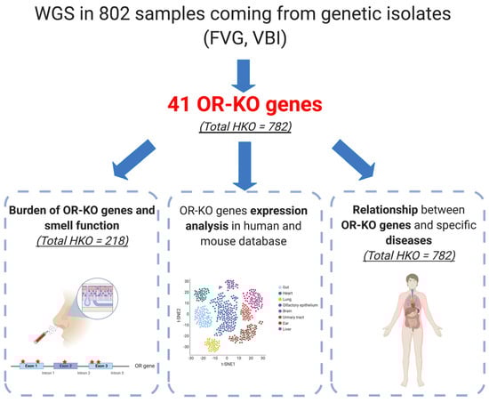 Workflow of the study. The picture summarizes the general workflow applied in the present study. Briefly, whole genome sequencing (WGS) data of 802 samples have been checked, searching for olfactory receptors (OR) genes carrying loss of function (LoF) variants. Data analysis led to the identification of 41 OR-KO (Olfactory Receptor knockout) genes in 782 subjects. Among those individuals, Sniffin’ Sticks test data were available for a total of 218 persons. The association between the burden of OR-KO genes and odor discrimination was tested, together with the analysis of OR-KO genes’ expression in human and mouse tissues and the correlation between OR-KO genes and specific diseases.