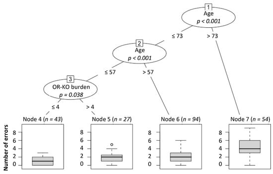 Conditional inference trees analysis (R “party” package) was used to test the influence of the burden of OR-KO genes (in addition to age, sex, and population) on smell functionality (number of errors in Sniffin’ Sticks test) [45,46]. This statistical method is efficacious in studies in which there are subgroups with different levels of response to the variables explained. Briefly, the following algorithm was applied [47]: (1) to test the global null hypothesis of independence between any of the explanatory variables and the response. It was interrupted if this hypothesis could not be rejected based on a Bonferroni correction (α = 0.05). Otherwise, it selected the explanatory variable with the strongest association to the response; (2) implementing a binary split in the selected explanatory variable; (3) recursively repeating steps (1) and (2).