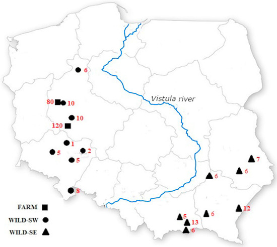The study area covered two regions of Poland, about 500 km apart, and separated by the River Vistula (Wisła). A total of 308 tissue samples (tongue slivers) were used in this study. The samples from unrelated farm foxes (n = 200, 85 males and 115 females, denoted FARM) were obtained from two fur farms (n1 = 120 and n2 = 80) located in western Poland, whereas those from wild foxes (n = 108, 52 males, 51 females, 5 sex unknown) came from 16 locations evenly distributed across the study area (n1 = 47 individuals, 8 sampling sites in south-western Poland, denoted WILD-SW; n2 = 61 individuals; and 8 sampling sites in south-eastern Poland, denoted WILD-SE). To ensure the lack of any relationship between the farm animals, their pedigrees, available in farm documentation, were meticulously analysed. The map with sampling sites is shown in Figure 1. We did not need permission from the ethics committee for this experiment, because all the tissue samples were taken post mortem. The samples from the farm foxes were collected after they had been killed at the end of the farm season, while those from wild foxes were collected after they had been killed by hunters or in road accidents.