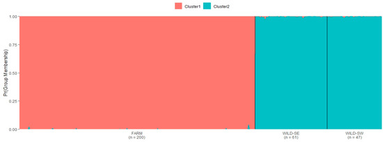 Bar plot showing probability of assignment for individual wild and farm red foxes at the most highly supported value of genetic clusters (K = 2).