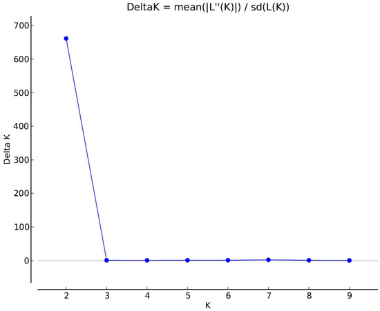 The Delta K plot showing the highest pick at K = 2 (the most probable number of genetic clusters).
