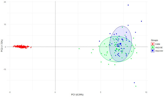 PCA carried out to show relationships between multi-locus genotypes in two-dimensional space (Figure 4) revealed that principal components (PCs) with eigenvalues > 1.0 explained 14.02% of the total variation in the data. Together, PC1 and PC2 accounted for 7.96% of the total variance (6.24% and 1.72%, respectively). The first two components were thus retained for further analysis. The scatter plot (Figure 4) showed that PC1 completely separated FARM and native foxes (WILD-SW and WILD-SE).