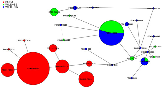 The most numerous haplotype in FARM was FOX9-FOX30 (n = 17), followed by FOX12-FOX32 (n = 8), and FOX14-FOX34 and FOX9-FOX33 (for both n = 7). In WILD-SW and WILD-SE the most numerous haplotype was FOX29-D408 (n = 7 and n = 6, respectively), followed by RF01-FOX36 (n = 4, WILD-SE) and FOX27-D09 (n = 3, WILD-SW).