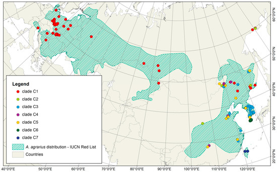 Origins of the samples used in the genetic analyses and their assignments to genetic clades of A. agrarius with geographic range of species, downloaded from IUCN Red List of Threatened Species. Version 2020-3.