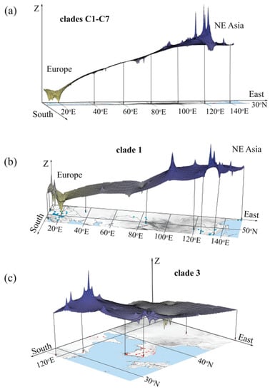 Spatial genetic divergence of A. agrarius in Eurasia (a) and within clades C1 (b) and C3 (c), visualized using the Landscape Shape Interpolation tool in Allele In Space, with three-dimensional surface plots. Surface plot heights (Z) reflect genetic distances between the corresponding populations.