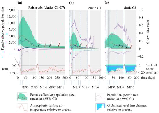 The reconstructed demographic history of A. agrarius obtained from the Bayesian skyline plot (BSP) in Eurasia (a), clade 1 (b), and clade 3 (c). Solid red lines—median, green areas—95% HPD confidence limits, violet lines—mean growth rates (with 95% HPD). The arrows indicate the estimated start of expansion based on the mismatch distribution estimation; black arrow—spatial expansion model, red arrow—pure demographic expansion model with either the standard evolutionary rate of 2.4% per Ma (solid line) or the fast evolutionary rate 3.6% per Ma (dotted line). The scales of the time axes (X) are the same. Vertical dashed blue lines indicate distinct last Glacial periods mentioned in text (late Weichselian—MIS 2, middle Weichselian MIS 3–4, early Weichselian MIS 5a–d). Grey area defines the glacial periods, with LGM marked in dark grey. The plot of temperature and sea level changes is based on [] and the extent of glacial periods and Marine Isotope stages based on [,,].