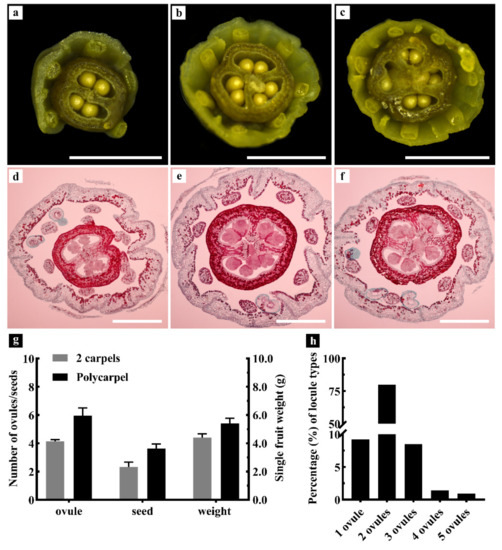 - Liang, J.; Guan, P.; Liu, Z.; Wang, Y.; Xing, J.; Hu, J. The VvSUPERMAN-like Gene Is Differentially Expressed between Bicarpellate and Tricarpellate Florets of Vitis vinifera L. Cv. ’Xiangfei’ and Its Heterologous Expression Reduces Carpel Number in Tomato. Plant Cell Physiol. 2020, 61, 1760–1774. [Google Scholar] [CrossRef]