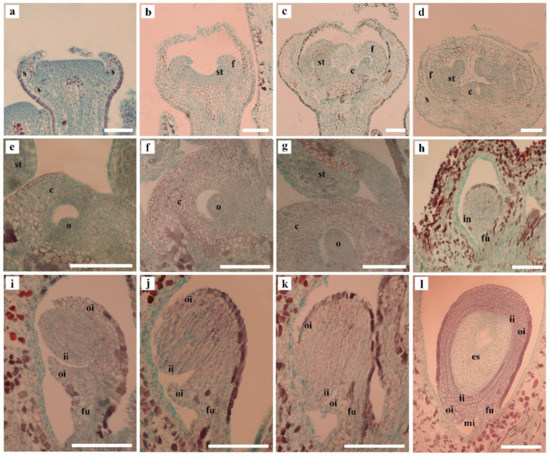 - Schneitz, K.; Hulskamp, M.; Pruitt, R.E. Wild-type ovule development in Arabidopsis thaliana: A light microscope study of cleared whole-mount tissue. Plant J. 1995, 7, 731–749. [Google Scholar] [CrossRef]