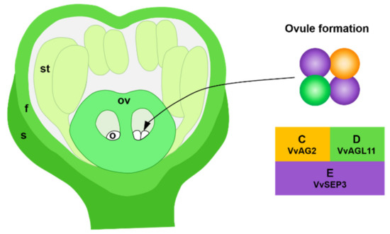 Wang, Y.; Liu, Z.; Wu, J.; Hong, L.; Liang, J.; Ren, Y.; Guan, P.; Hu, J. MADS-Box Protein Complex VvAG2, VvSEP3 and VvAGL11 Regulates the Formation of Ovules in Vitis vinifera L. cv. ‘Xiangfei’. Genes 2021, 12, 647. https://doi.org/10.3390/genes12050647
