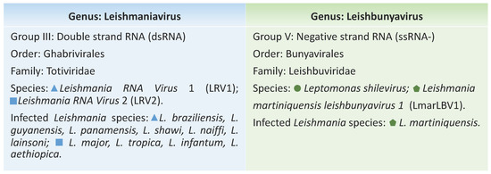Totiviridae consists of five genera: Giardiavirus, Leishmaniavirus (LRV), Trichomonasvirus, Totivirus, and Victorivirus. According to ICTV, Leishmania RNA virus 1 (LRV1) and Leishmania RNA virus 2 (LRV2) belong to the Leishmaniavirus genus. LRV was assumed to be capable of infecting Leishmania spp. only, with the two species identified as LRV1 and LRV2 (Figure 1), but recently, a member of this genus was also found in Blechomonas spp., a monoxenous trypanosomatid parasitizing fleas [15].