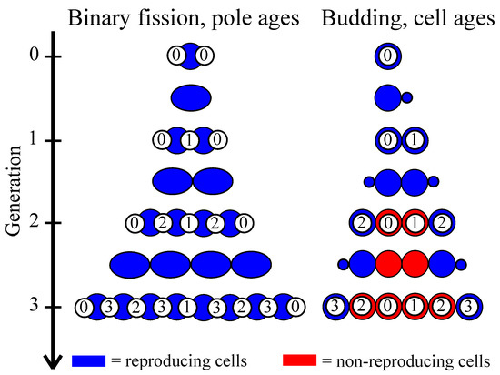 Budding and binary fission are two common modes of reproduction in single-celled organisms. With budding, a parent cell creates an outgrowth that eventually becomes a daughter cell. With binary fission, a parent cell reproduces by splitting in half. Both types of reproduction are common among unicellular organisms [45], and can be found within extant multicellular taxa. For example, multicellular cyanobacteria [46] typically grow via binary fission, as do plant and animal cells [47], and filamentous fungi grow via budding [48]. Although both mechanisms of reproduction give rise to two cells, they are not identical. Budding creates a clear parent/offspring distinction in which age-related damage, e.g., oxidatively damaged proteins and protein aggregates, is split asymmetrically between parent and daughter cells (see review [49]). In contrast, binary fission partitions components more symmetrically which is readily observable in the age of the cell poles of the two resulting cells (the age of cell poles correlates with age-related damage [50]). Since aging can correspond to a decrease in the rate of reproduction, it affects the relative rates that cells in a population reproduce and thus the rate that a new mutant may spread.
