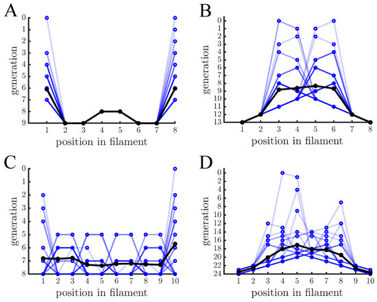 Age distribution within multicellular filaments. (A) The age of cells within multicellular filaments is shown as a function of cell position. Cells reproduce via binary fission and filaments reproduce once they reach 8 cells— different blue lines indicate different multicellular filaments and black lines indicate the population mean. A cell’s age corresponds to the generation that its oldest pole was created. In this case the oldest cells are at the ends of the filament and the next oldest cells are in the middle. (B) The graph is similar in structure to (A) except cells reproduce via budding so cell age is the generation in which the cell was created. Contrary to binary fission, the ends of the filaments contain the youngest cells and the older cells are in the middle. (C,D) The graphs are similar to (A,B), respectively, except that multicellular filaments reproduce at 10 cells. Budding has the same basic age structure but binary fission has a less regular pattern because not every cell has reproduced (i.e., filament size is not a power of 2).