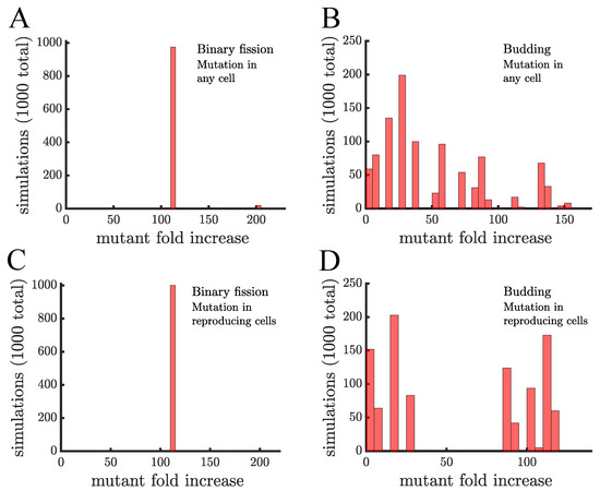 The spread of a fast-growing mutant without age-related fitness costs. (A) A histogram shows the fold increase of the mutant fraction (, where the initial fraction is ) for independent simulations of a population reproducing via binary fission. In this panel the mutation is introduced in a random cell from the entire population regardless of when it reproduces. There is almost no dispersion in the histogram because at the point the mutation is introduced every cell is identical. The only outlier bar comes from the case in which the mutation is introduced in a cell that is just about to reproduce, i.e., the mutation is introduced when the population reaches 1000 but by the end of that time step the population will be 1024. (B) This panel shows the same type of data as a) but for a population of cells reproducing via budding. Here, cell reproduction depends on location in the filament so at the point the mutant is introduced cells differ in terms of their next expected reproduction time. The histogram is much more dispersed and the majority of simulations (868) have a lower mutant fold increase than in populations reproducing via binary fission in (A). (C,D) These panels are similar to (A,B), respectively, except the mutant is introduced in cells that just reproduced. This has no effect on binary fission populations but in budding populations it produces a more bimodal distribution with 498 mutations having a fold increase >75 and 502 having a fold increase <30, depending on whether the mutation occurs in the daughter or parent cell, respectively.