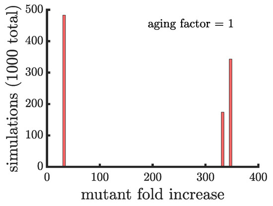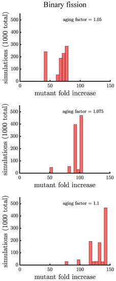 The spread of a fast-growing mutant in binary fission populations with age-related fitness costs. Plotted are histograms of the fold increase of the mutant fraction (, where the initial fraction is ) for independent simulations experiencing different age-related fitness costs. The aging factor (the parameter b in Equation (1)) is the multiplicative factor by which reproductive time increases with age such that means a increase in reproductive time in the simulations. As the aging factor is increased the distribution shifts to the right indicating that the final mutant fraction increases in simulations. See Appendix C, Appendix D and Appendix E for robustness analyses and companion figures using different simulation parameters.