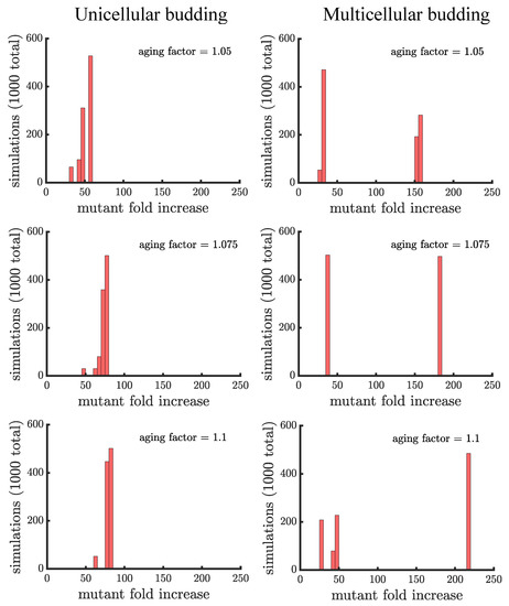 The spread of a fast-growing mutant in budding populations with age-related fitness costs. (left) Plotted are histograms of the fold increase of the mutant fraction (, where the initial fraction is ) for independent simulations of unicellular budding populations experiencing different age-related fitness costs (similar in structure to Figure 4). Increasing the aging factor shifts the distribution to the right elevating the final mutant fraction. (right) Plotted are another set of histograms similar to the left panel except for multicellular budding populations. Compared to the unicellular budding populations, the distributions are more bimodal. If we consider the higher mode of the distributions we find that again the aging factor increases the final mutant fraction but by a much greater amount than in the corresponding unicellular populations: in a multicellular budding population for an aging factor of compared to in the unicellular budding population. See Appendix C, Appendix D and Appendix E for robustness analyses and companion figures using different simulation parameters.
