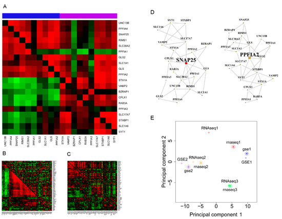 Internal correlation rewiring of pathways perturbed in schizophrenia (SCZ). (A–C) correlation coefficient heatmaps for three pathways: “glutamate neurotransmitter release cycle” (A), “L1CAM interactions” (B), and “MHC class II antigen presentation” (C). The three heatmaps are derived from expression datasets GSE1, RNAseq3, and RNAseq1, respectively. In each heatmap, the lower triangle and the upper triangle cover gene-gene co-expression level in the control and SCZ groups, respectively. The color bar on top of the heatmap indicates two subgroups of “glutamate neurotransmitter release cycle” genes in the normal condition. (D) Gene co-expression networks formed by 20 genes of pathway “glutamate neurotransmitter release cycle” (data source: GSE1). Left, control; right, SCZ. Two highlighted genes (SNAP25 and PPFIA2) are the hub gene in control and SCZ, respectively. Of note, a hub gene does not necessarily have the most connections in the network because it is identified as having the highest regulatory impact (overall co-expression synchrony with all other genes) rather than the highest degree. (E) Principal component analysis summarizes pathway rewiring result out of ten separate method-dataset combinations. Uppercase, results from gene sets net correlations analysis (GSNCA); lowercase, results from method gene set co-expression analysis (GSCA). RNAseq1, RNAseq2, RNAseq3, GSE1, and GSE2 are all gene expression dataset names, with details given in Table 1.