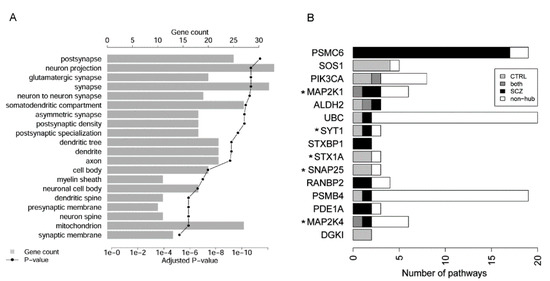 Cellular localization and pathway affiliation of pivotal pathway hub genes. (A) Top 20 significantly overrepresented cellular components of 92 pivotal genes. From top to bottom, components were ordered by decreasing statistical significance. (B) Number of pathways where a pivotal gene appeared as a hub. Genes were ordered by the number of pathways (colored bar length) where the gene appeared as a hub in either control (CTRL) or SCZ samples. Five gene products localized in “neuron projection” were labeled by asterisk (*).