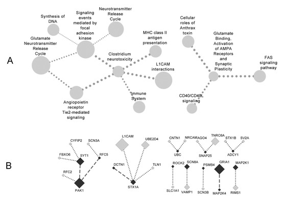 In companion with the disrupted crosstalk of pathway entities (Figure 4A), we presented the disconnected gene links (Figure 4B) underpinning the revealed pathway crosstalk disruptions. We showed 21 correlation-loss gene links covering 14 pivotal hub genes, where four links connected pivotal genes on both ends. According to the reference correlation database CoXpressDB [58], gene pairs PAK1:SYT1, PAK1:RFC5, DCTN1:STX1A, and GRIA1:MAP2K4 are universally highly correlated (correlation coefficients close to or above 0.30). However, these pivotal inter-connections broke apart in SCZ transcriptomes, accounting for the observed pathway crosstalk disruptions to a large extent.