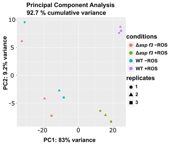 Principal component analysis of transcriptome data from wild type Aspergillus fumigatus (WT) and a strain lacking the asp f3 gene (Δasp f3) grown with (+ROS) or without (−ROS) reactive oxygen species (ROS). The strains, treatments and biological replicates are represented by different colours and symbols, respectively.