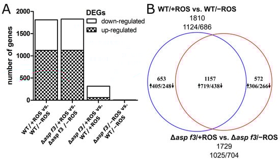 ROS exposure induced a shift in the global transcriptome with nearly identical numbers of DEGs for both strains. For the wild type and Δasp f3 mutant we identified 1810 and 1729 ROS dependent DEGs, respectively. The numbers of up- and downregulated genes are likewise similar, identifying 1124 up- and 686 downregulated genes for the WT and 1025 up- and 704 down-regulated genes in Δasp f3 (Figure 2A). However, when the DEGs were compared between the two strains, we found only about two thirds of them in congruency. This proportion was comparable for up- as well as for the down-regulated genes (Figure 2B).