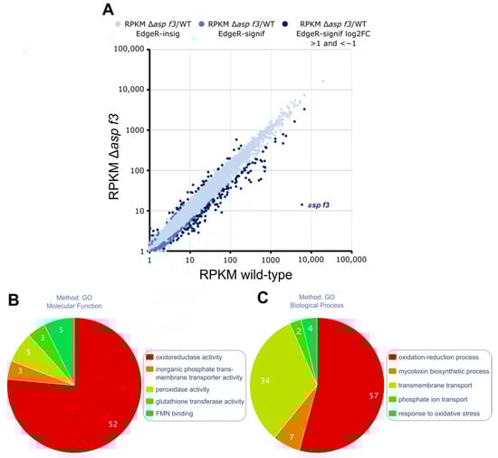 Global transcription in wild type and an asp f3 deletion mutant of Aspergillus fumigatus after treatment with ROS. (A): Differential gene expression displayed as RPKM values of single genes in the asp f3 deletion mutant (Δasp f3) and the wild type (WT) during oxidative stress. Differences in gene expression were defined as either insignificant (bright blue) or significant (blue) according to EdgeR. Genes with log2 fold differences >1 and <−1 are highlighted in dark blue. (B,C): Gene ontology enrichment according to Molecular function (B) and Biological process (C) of genes specifically down-regulated in Δasp f3 in response to ROS.