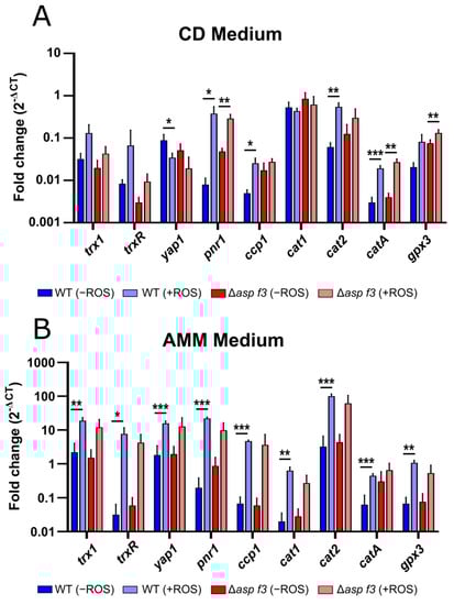Several genes with a major role in the redox-homeostasis and the defense against oxidative stress were upregulated in the wild type (Table 2), among them three confirmed targets of the major activator AfYap1 []: the bifunctional catalase-peroxidase (cat2, AFUA_8g01670), the Cytochrome c peroxidase (ccp1, AFUA_4G09110), and the p-Nitroreductase family protein (pnr1, AFUA_5g09910). The latter is not only known to be strongly induced by diverse environmental stresses such as superoxide stress, osmotic stress and heat stress but is also expressed when the fungus is exposed to neutrophils [,]. However, other putative AfYap1-targets suggested by Lessing and colleagues [], such as the mitochondrial peroxiredoxin (Prx1) or methionine synthase, were not significantly affected in the transcriptome data set of the wild type or the mutant. The expression of the putative Afyap1 targets, the yap1 itself, and several other ROS defense genes was analyzed by qRT-PCR in two different conditions (Figure 5). Expression of ROS defense genes in Czapek-Dox (CD) medium (Figure 5A), which was also used to generate the transcriptome data, was approximately an order of magnitude lower than in Aspergillus minimal medium (AMM) which was supplemented with added trace metals as a major difference (Figure 5B). For both wild type and Δasp f3 the expression of the Afyap1 gene was comparably lower in CD than in AMM even without the addition of ROS stress. For both strains the transcript levels were also not significantly affected by the addition of ROS in CD, while a significant induction of the regulator gene Afyap1 was detected for both strains in AMM. For several other ROS defense genes, including the putative Afyap1 targets ccp1, cat2, and pnr1, ROS dependent activation was lower in hyphae of the asp f3 deletion mutant. This lack of activation was also more pronounced in the trace metal free CD medium. ROS mediated induction of catA and gpx3 were detected for both strains in both media.