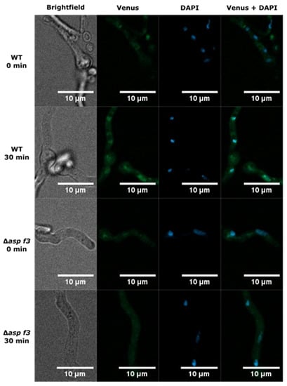 A total of 105 conidia were incubated at 37 °C for 10 h in 300 μL of CD in ibidi® μ-slide (ibidi, Gräfelfing, Germany) until germination. The nuclei were then stained with NucBlue™ Live ReadyProbes™ Reagent (ThermoFisher, Dreieich, Germany) according to manufacturer’s guidelines. Afterwards, 2 mM H2O2 was added and after 30 min the samples were subsequently analyzed under the microscope. Fluorescent stain and proteins were excited with 408 nm and 488 nm, respectively, to analyze the localization of AfYap1VENUS in both WT and Δasp f3 strains using a Zeiss Axio Observer Spinning Disk Confocal Microscope (ZEISS, Jena, Germany) using ZEN software (Version 2.6). Microscopic images were evenly processed and analyzed with ImageJ software [].
