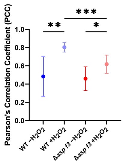 Quantification of co-localization of DAPI and AfYap1VENUS dependent fluorescence signals. Pearson’s correlation coefficient (PCC) for DAPI and AfYap1VENUS co-localization calculation in the presence and absence of H2O2 in the wild type and Δasp f3 background strains. The data represents the mean and standard deviation from at least three independent experiments (n ≥ 3). Significant differences calculated by Student’s t-test are shown as *: p < 0.05; **: p < 0.01; ***: p < 0.001.