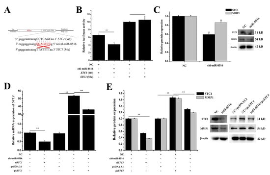 3.2. Chi-miR-8516 Regulates the Expression of MMP1 by Targeting STC1