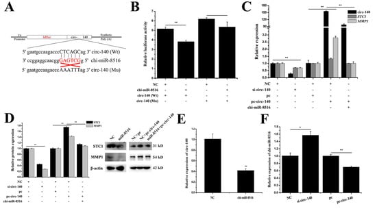 3.3. Circ-140 Sponges chi-miR-8516 and Regulates the Expression of STC1 and MMP1